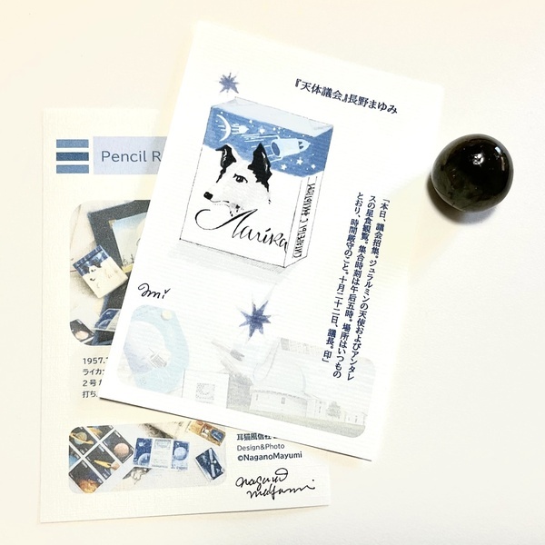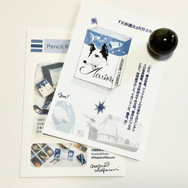長野まゆみDesignの「Pencil Rocket Opera」、「ライカ犬(天体議会の挿絵)」イラストカード、宇宙的な鉱石標本1個とのセットです。