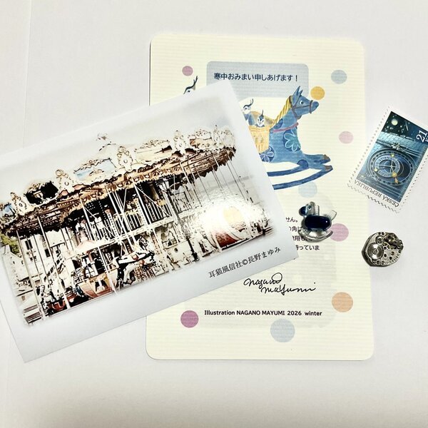 2026年、長野まゆみ描きおろしのポストカード(直筆サイン入り)と、海外の風景写真、時計部品(古物)、樹脂製ボタンとのセットです。