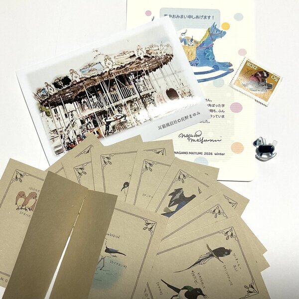 2026年、長野まゆみ描きおろしのポストカード(直筆サイン入り)と、海外の風景写真、鳥のミニカード(長野まゆみ・イラスト)、樹脂製ボタンとのセットです。