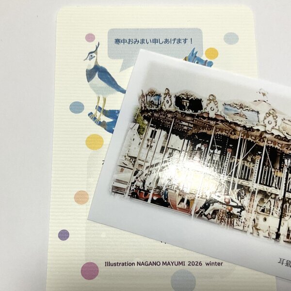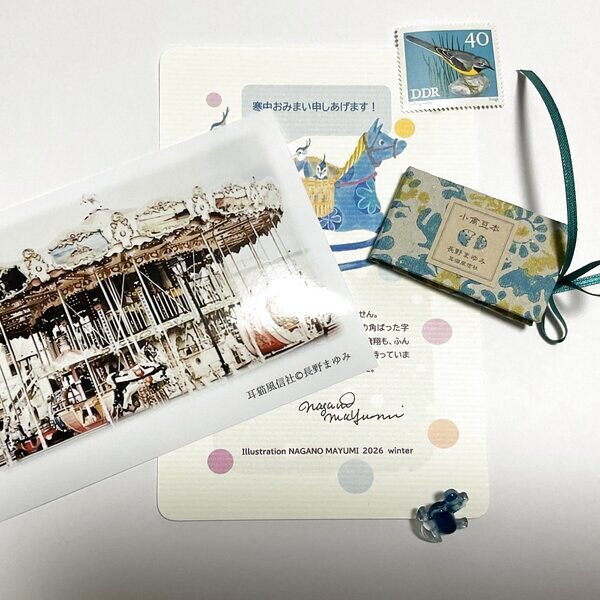 2026年、長野まゆみ描きおろしのポストカード(直筆サイン入り)と、海外の風景写真、小禽豆本(長野まゆみ)、樹脂製ボタンとのセットです。
