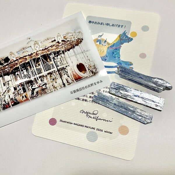2026年、長野まゆみ描きおろしのポストカード(直筆サイン入り)と、海外の風景写真、鉱石標本1個のセットです。