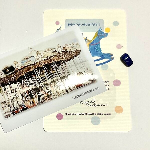 2026年、長野まゆみ描きおろしのポストカード(直筆サイン入り)と、海外の風景写真、鉱石標本1個のセットです。