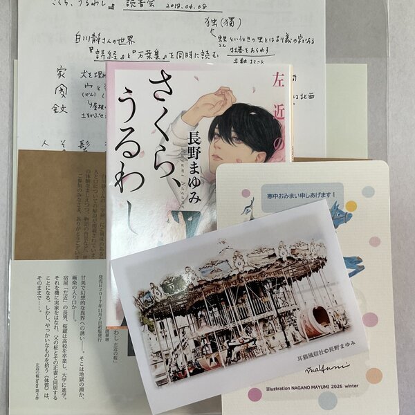 長野まゆみ新作「寒中おみまい申しあげます」ポストカードと、文庫「さくら、うるわし 左近の桜」(角川文庫)、レジュメのセットです。