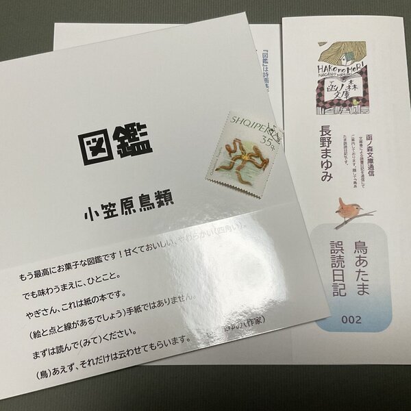 『小笠原鳥類/著「図鑑」ライトバース社』1冊と長野まゆみ蒐集の生物切手とのセットです。